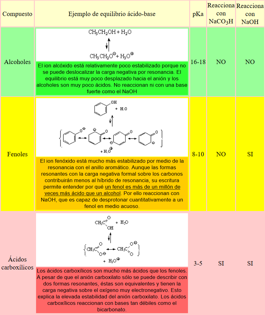 La diferente acidez de alcoholes, fenoles y ácidos carboxílicos, y sus diferencias en su reactividad con NaCO3H y NaOH, permite efectuar su separación en el laboratorio con mucha facilidad. ¿Se te ocurre cómo?