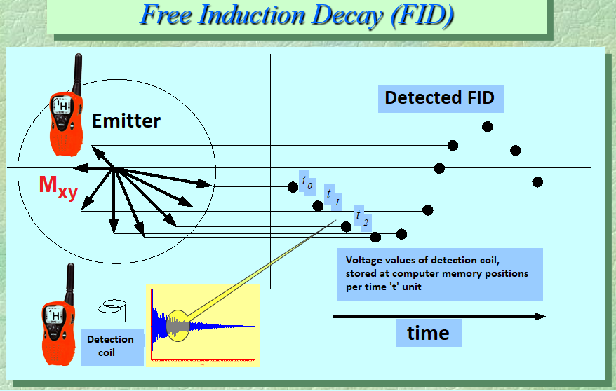 Last but not least, please notice that the FID is a time-domain signal, because it is the mere evolution of a voltage with time, that our "walkie-talkie” receptor transferred to the computer that finally digitalized it.